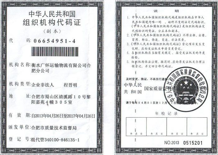 衡水广怀运输物流有限公司合肥分公司组织机构代码证